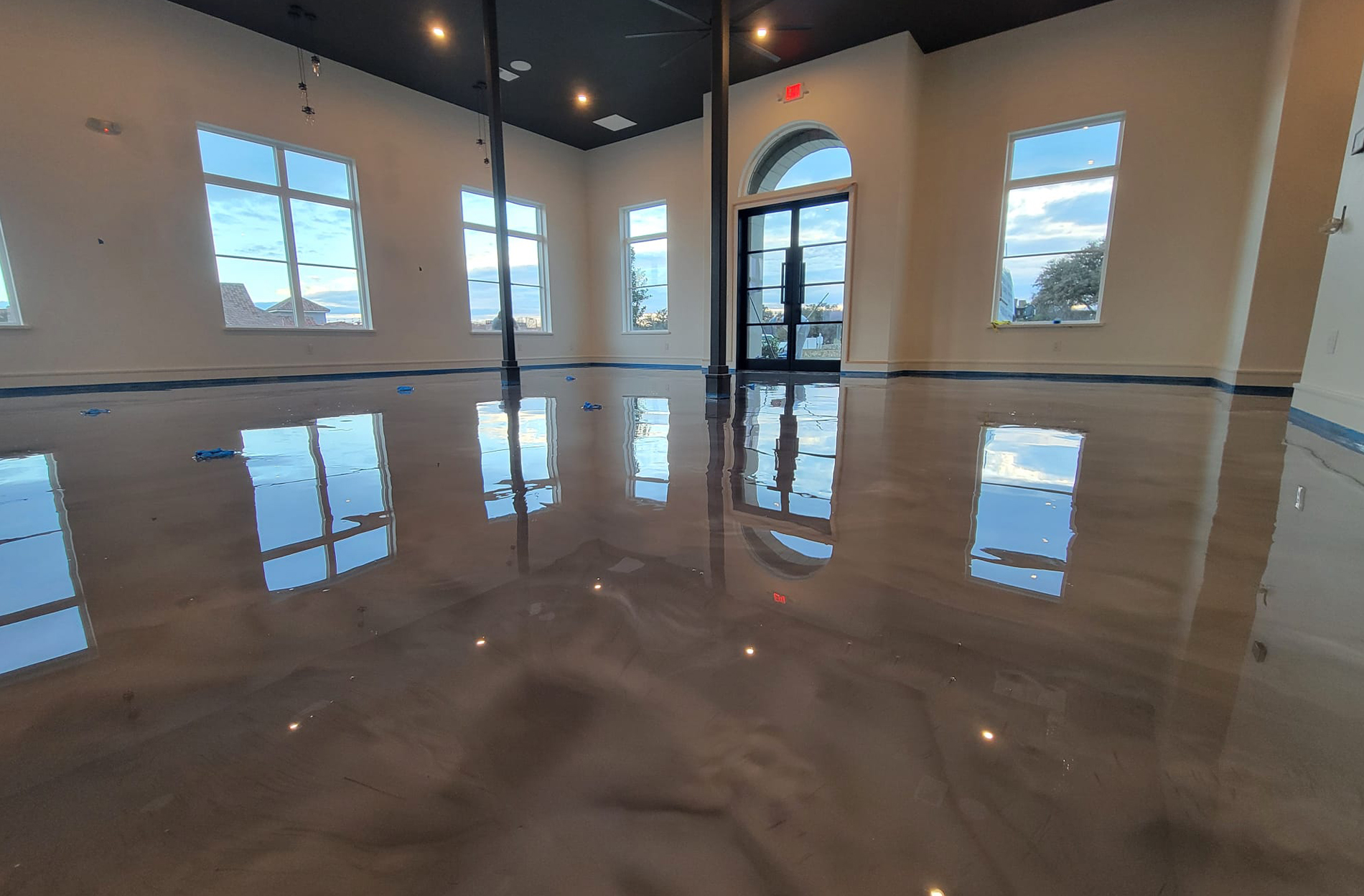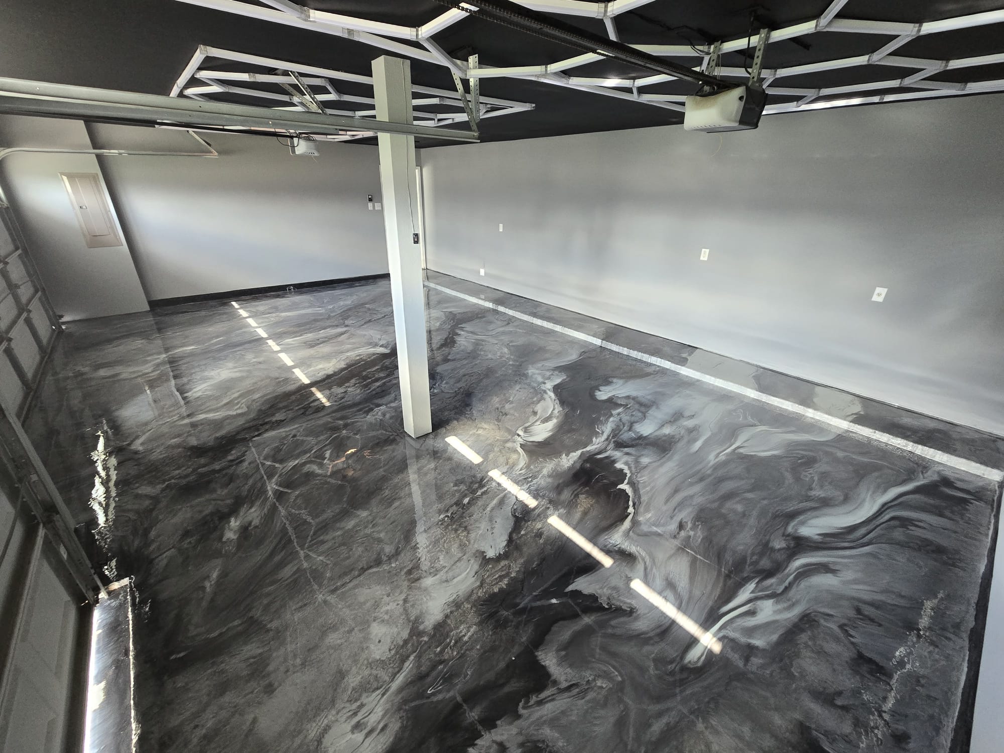 Our metallic epoxy flooring combines high-gloss finishes with dynamic, three-dimensional effects to create truly one-of-a-kind surfaces. Swirls, shimmer, and depth give these floors the look of marble, flowing lava, or liquid metal—perfect for modern interiors, showrooms, salons, and high-impact residential spaces. Beyond the visual appeal, metallic epoxy is seamless, stain-resistant, and built to last. It’s where art meets durability, and your floors become the focal point.