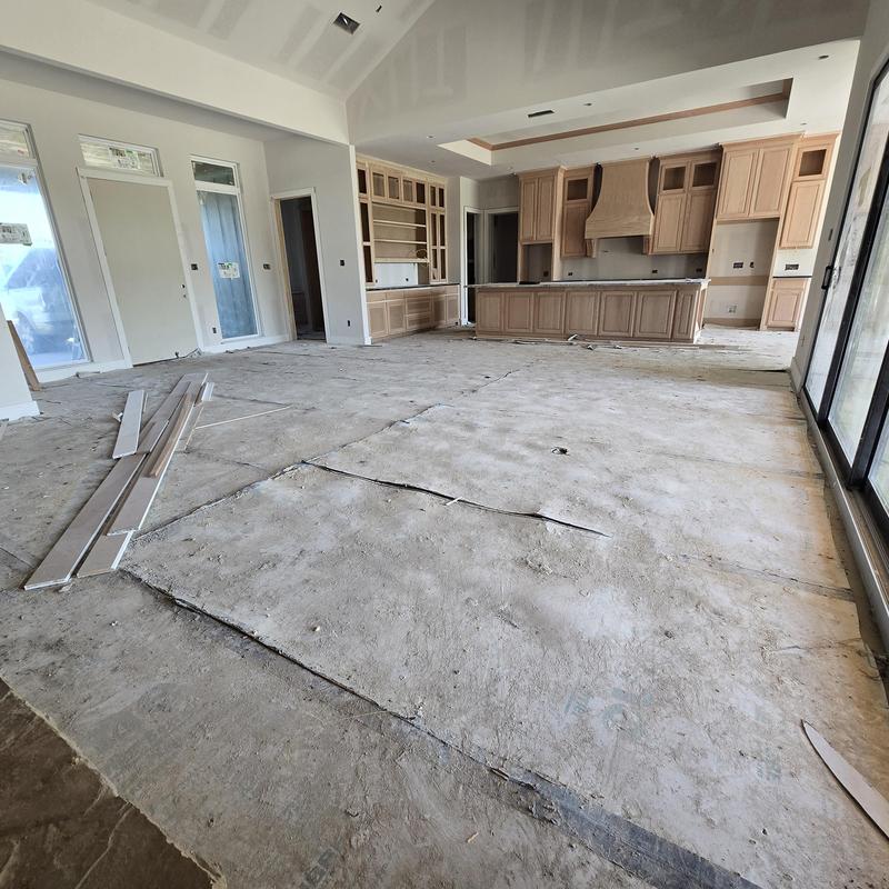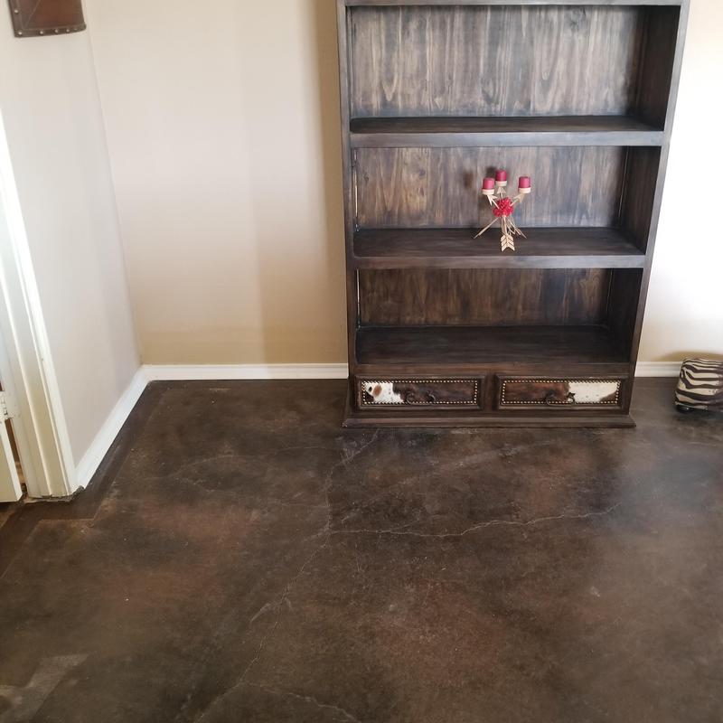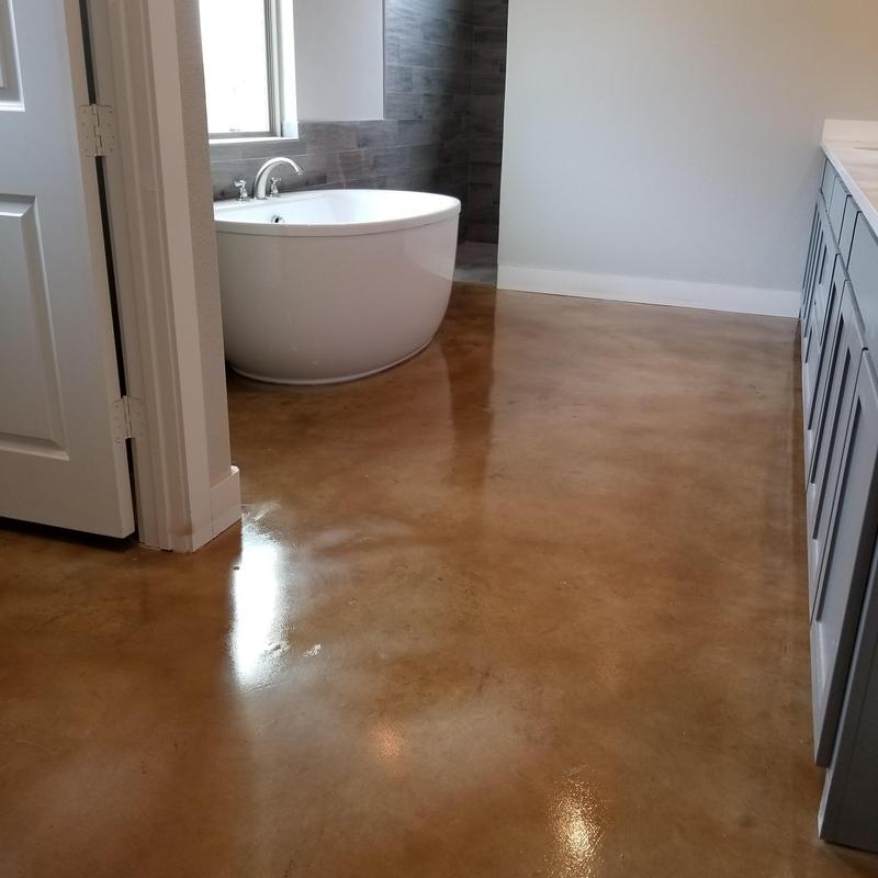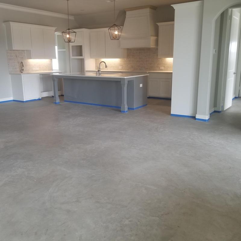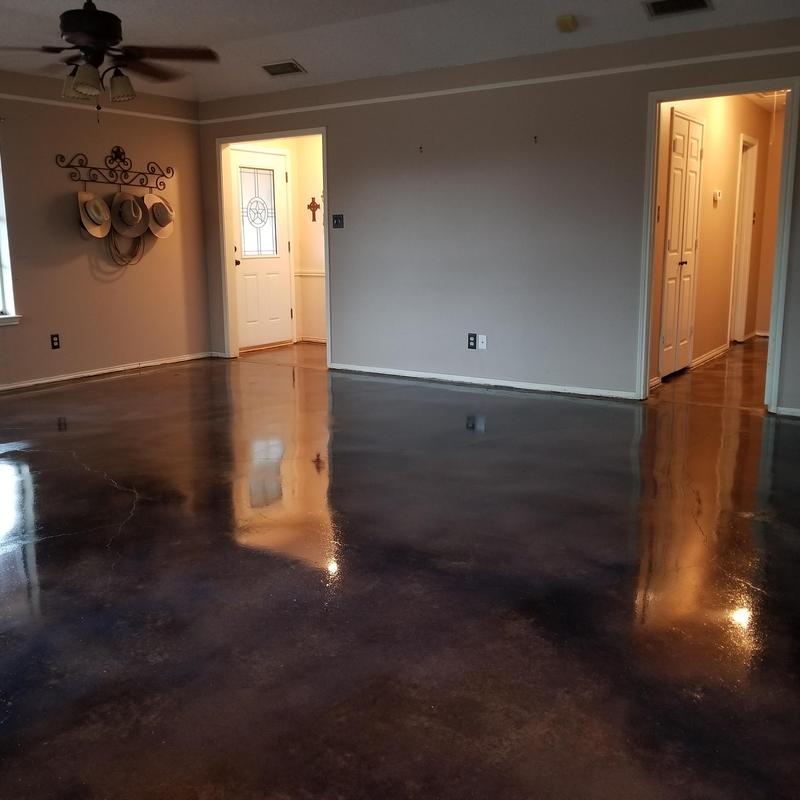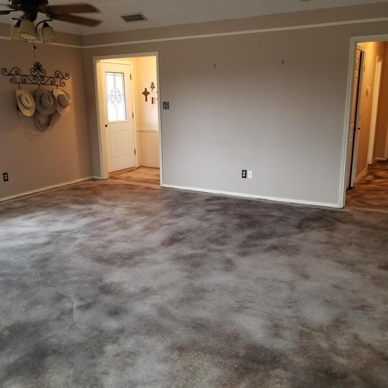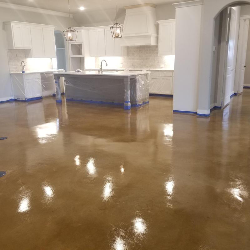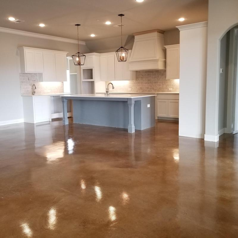 Contractors stained the entire interior concrete floor of a residential house using acid stain and applied a polyurethane top coat. This process created a sealed, durable surface with a consistent finish. Service completed in McKinney, Texas.