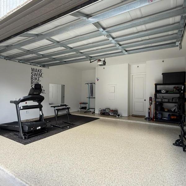 Epoxy Floored installed a new epoxy floor in a garage to support its use as a home gym. The durable surface offers easy cleaning and improved function. This project took place in Celina, Texas.