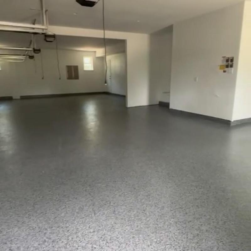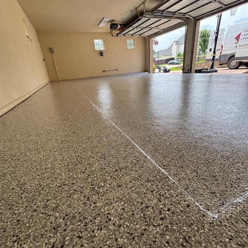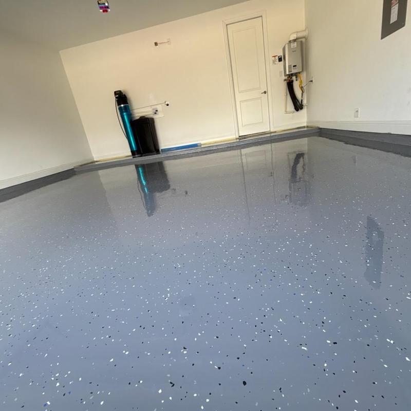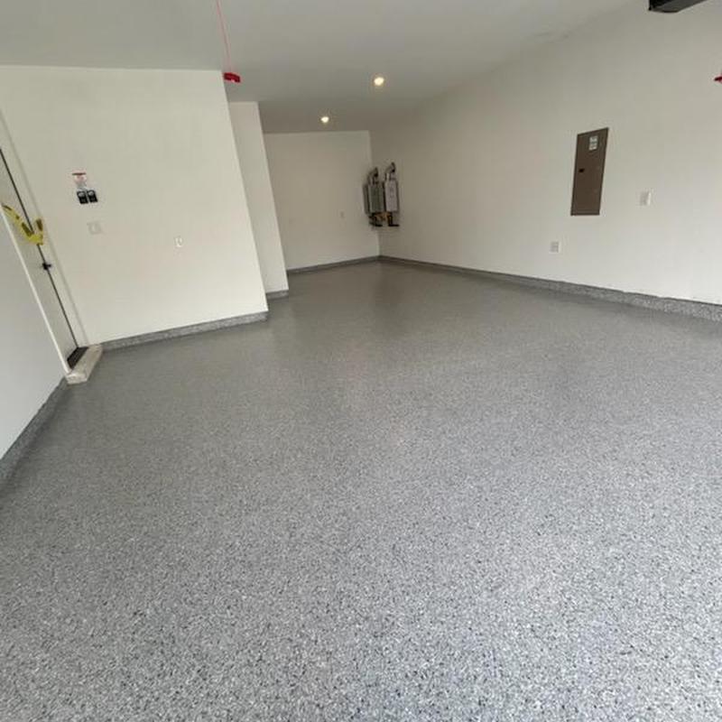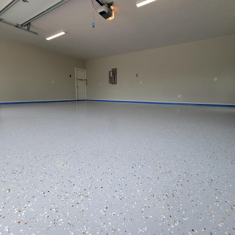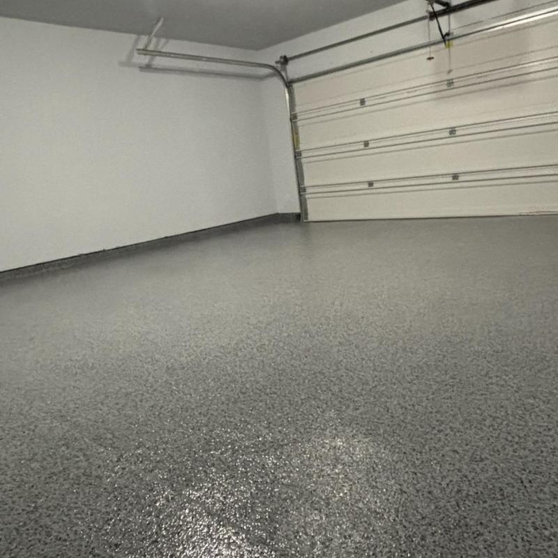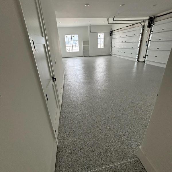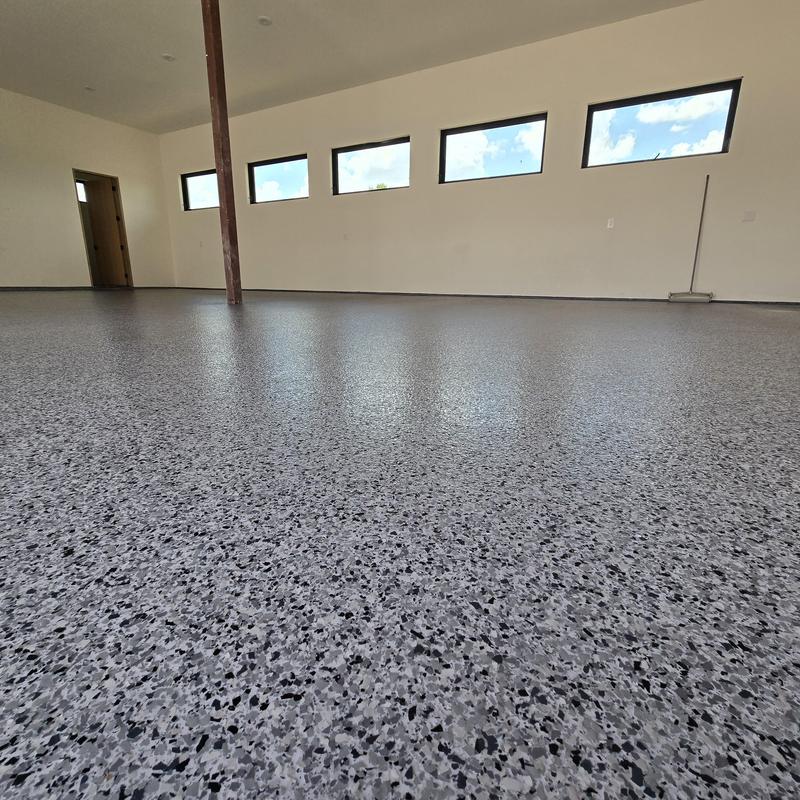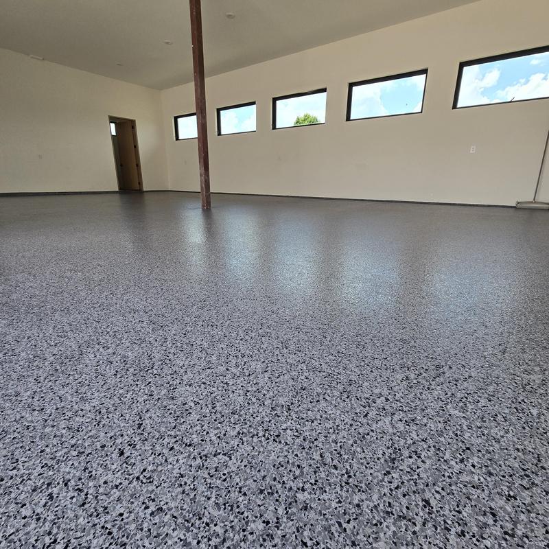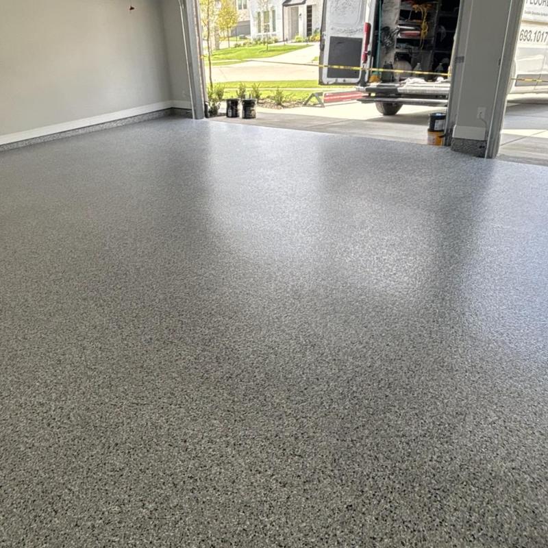 Installed a snowfall blend epoxy floor with a polyaspartic topcoat and antiskid finish for a builder in Celina, Texas. The coating improves surface durability and traction. This setup supports safety and long-lasting performance in everyday use.