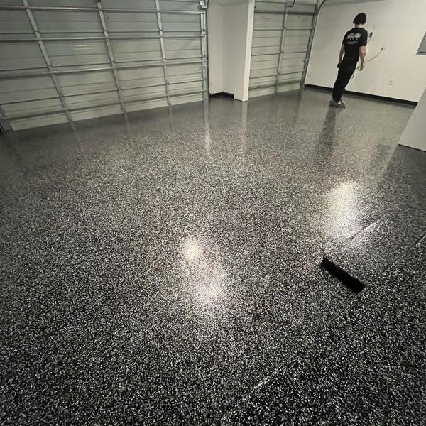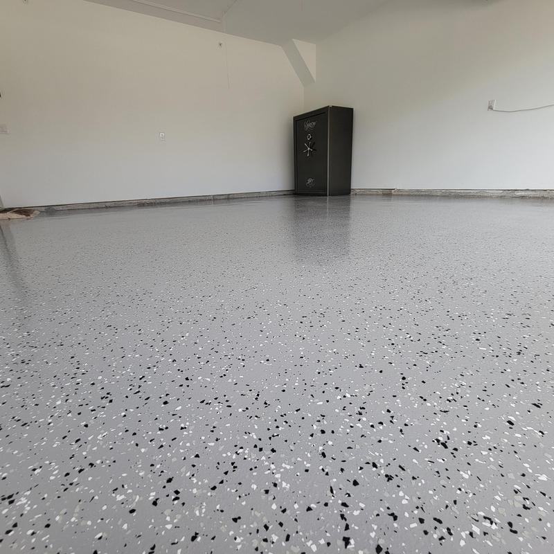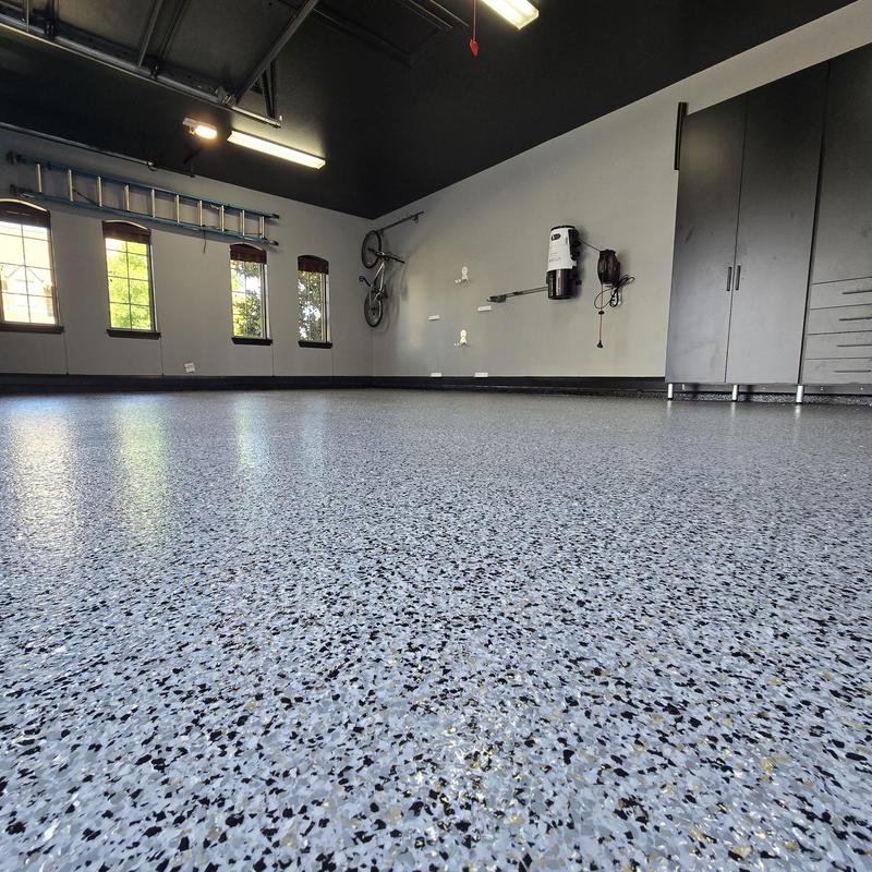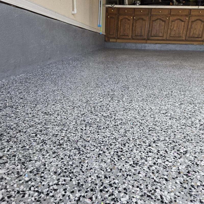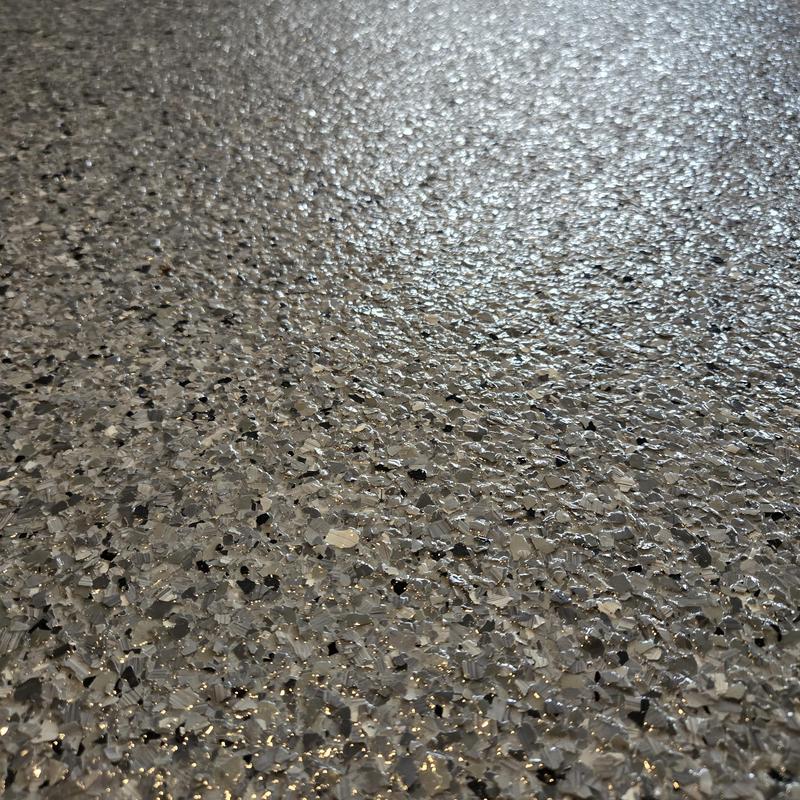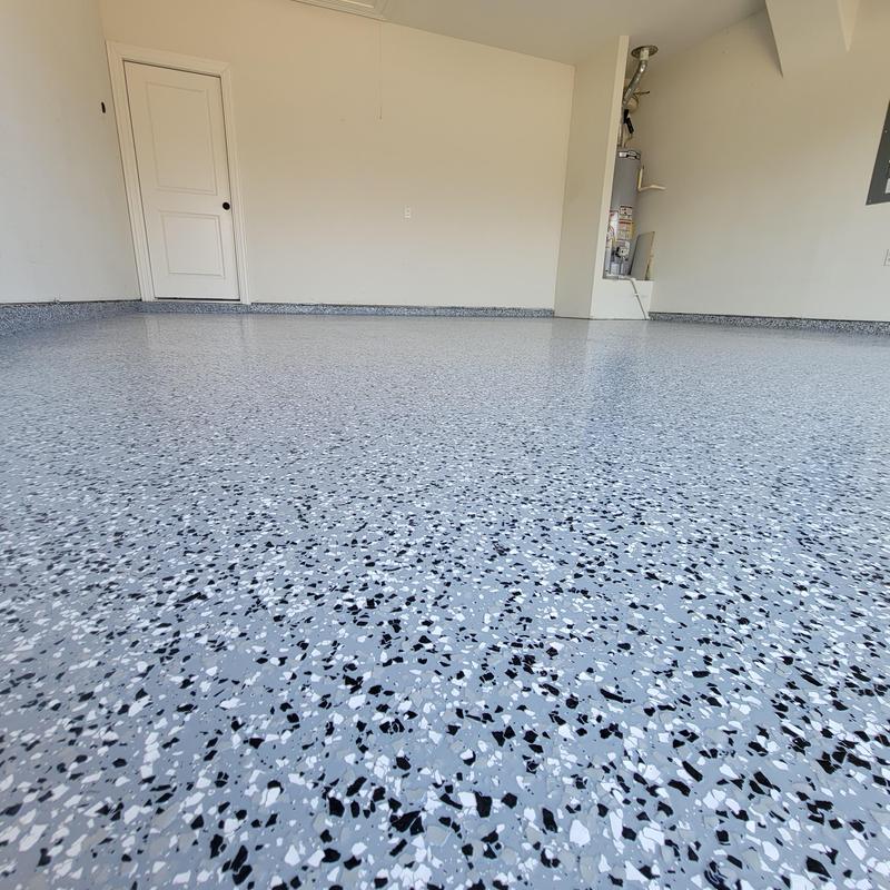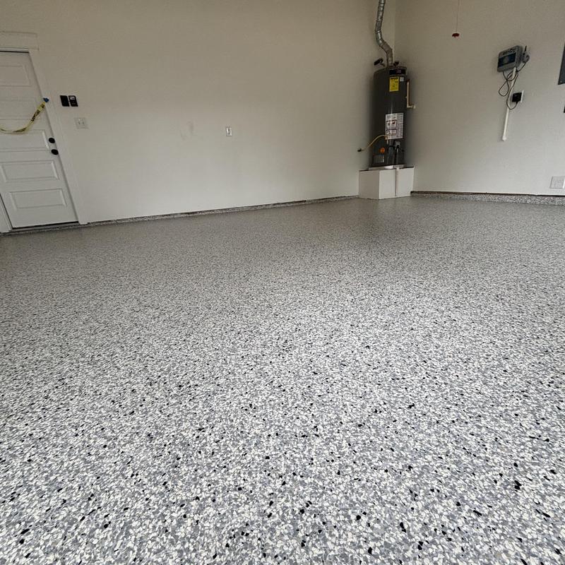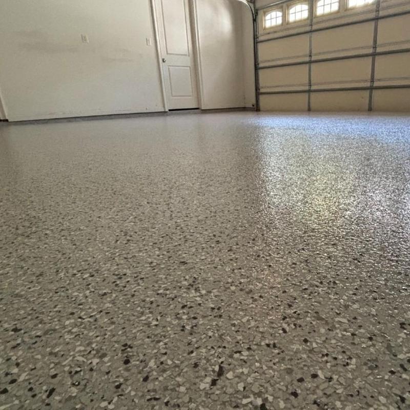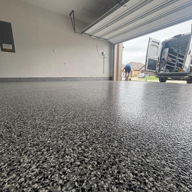 Epoxy Floored applied a slate gray base with 70% Domino flake coverage to a garage floor in McKinney, Texas. The team finished the surface with a water-based polyurethane top coat and added an anti-skid layer for improved safety and durability.