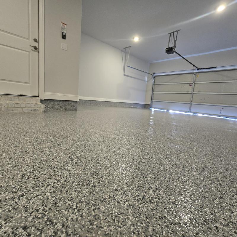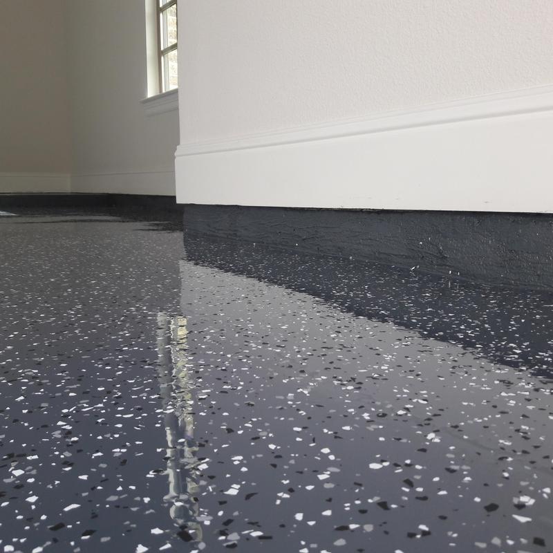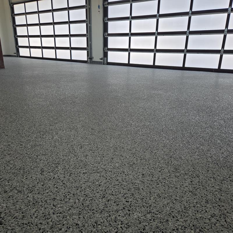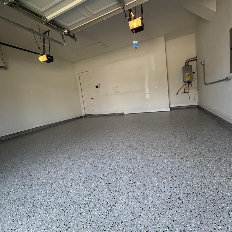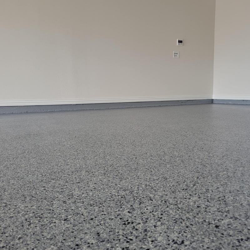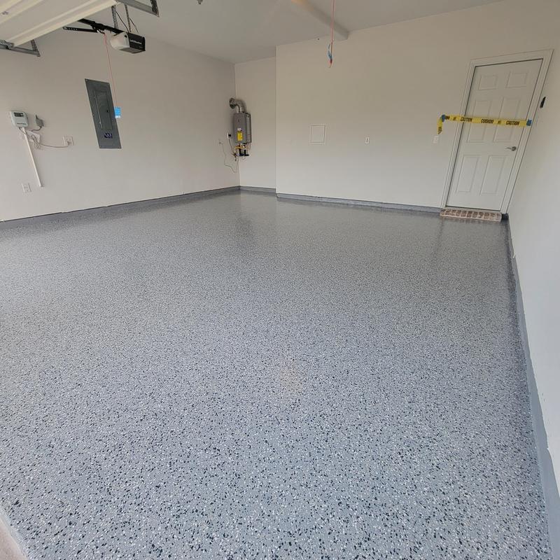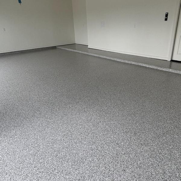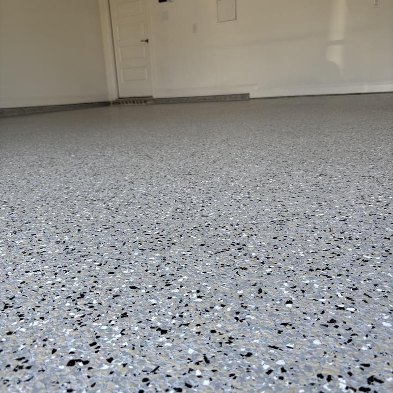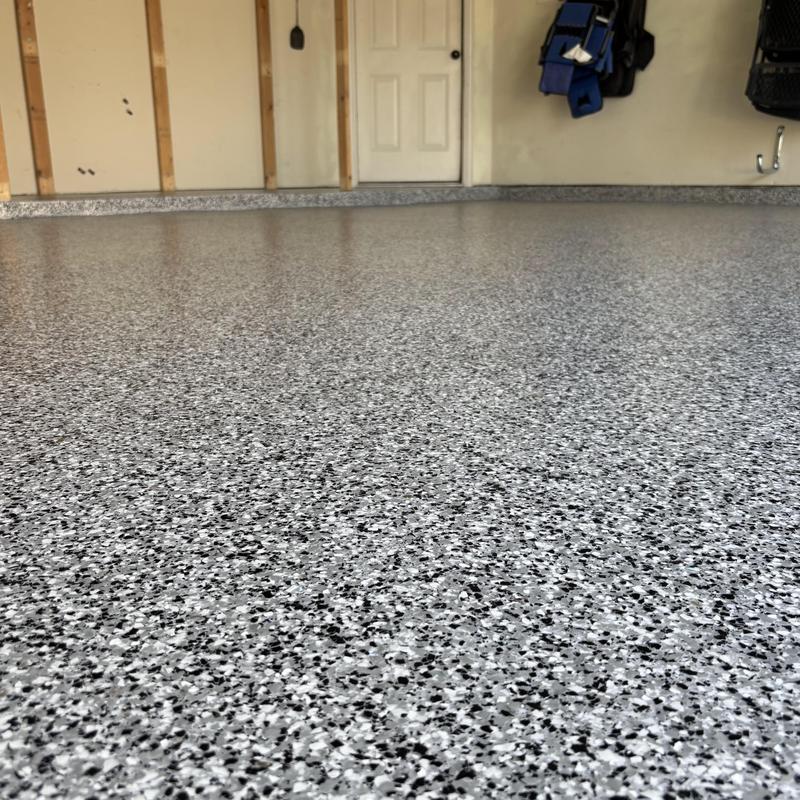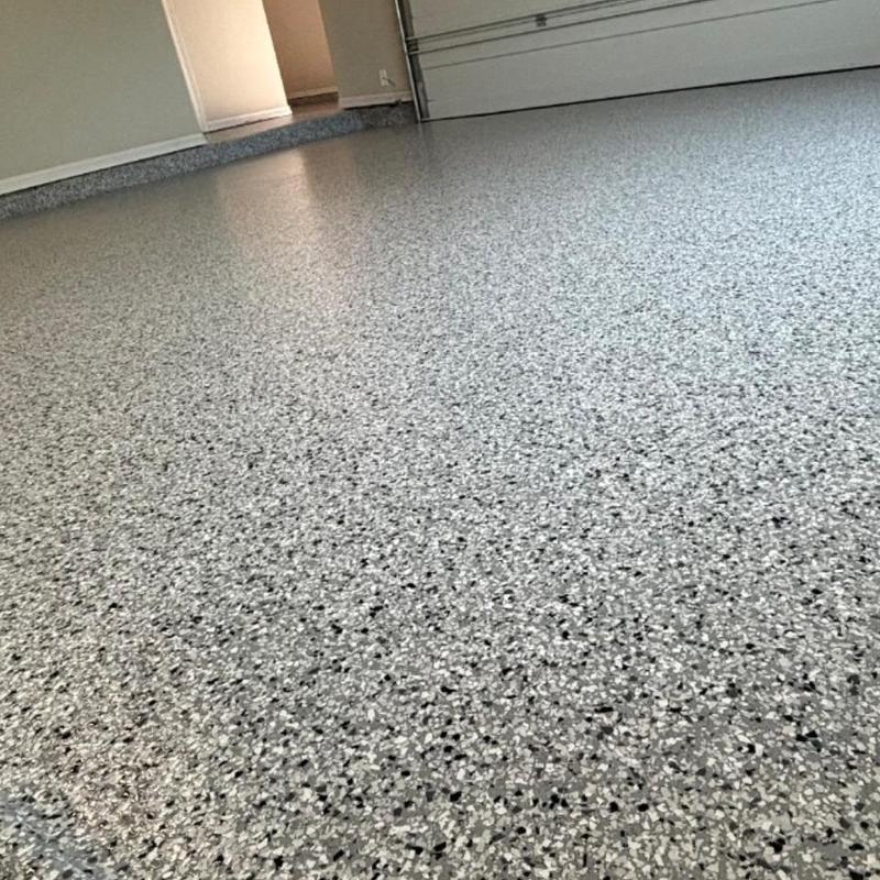 Epoxy Floored applied a slate gray base with 70% Domino flake coverage to a garage floor in McKinney, Texas. The team finished the surface with a water-based polyurethane top coat and added an anti-skid layer for improved safety and durability.