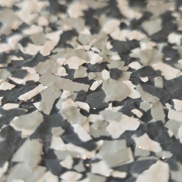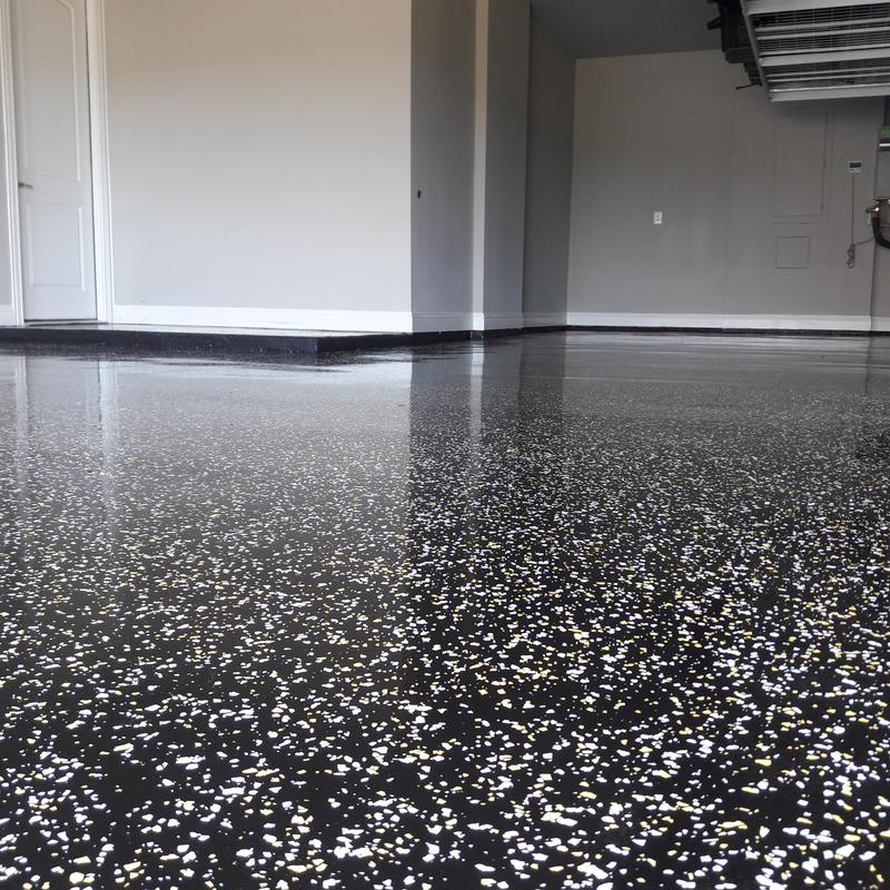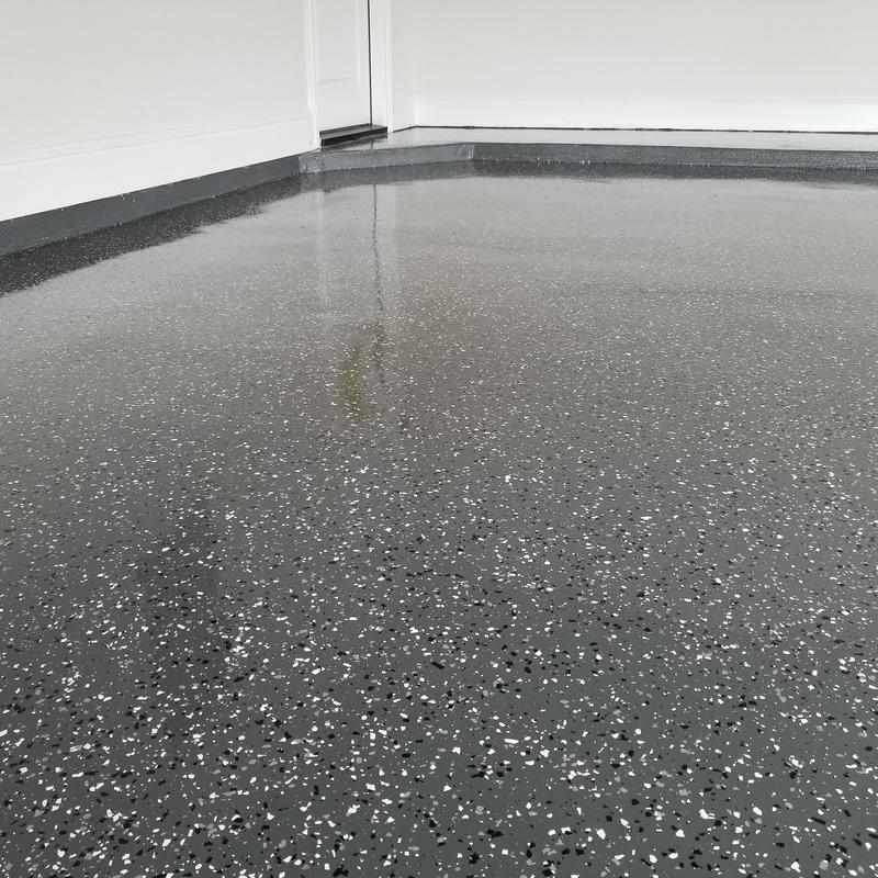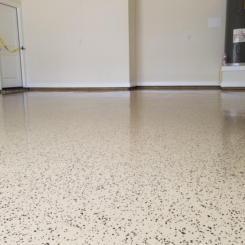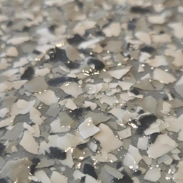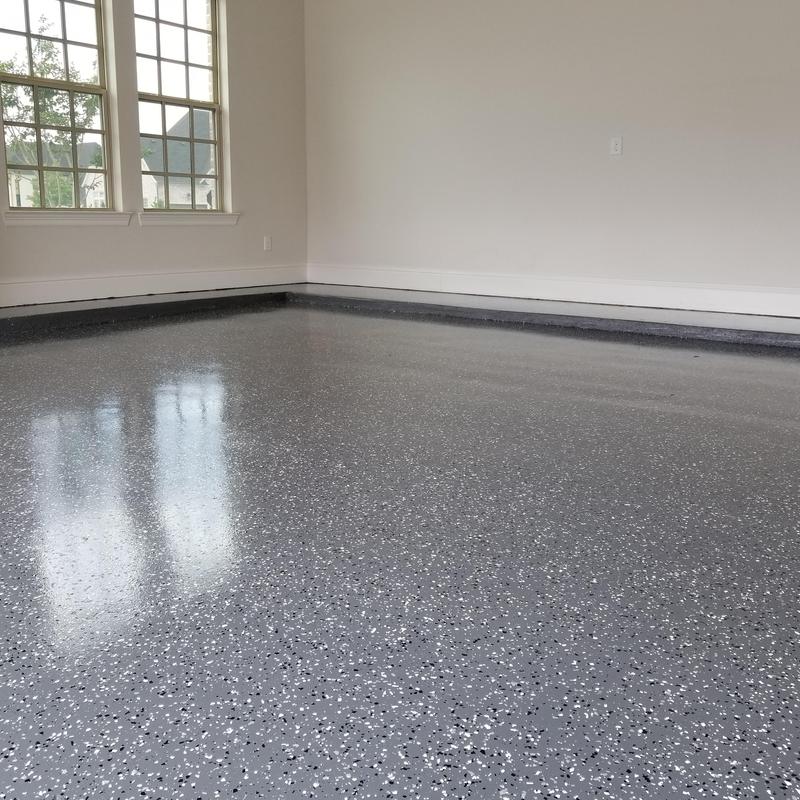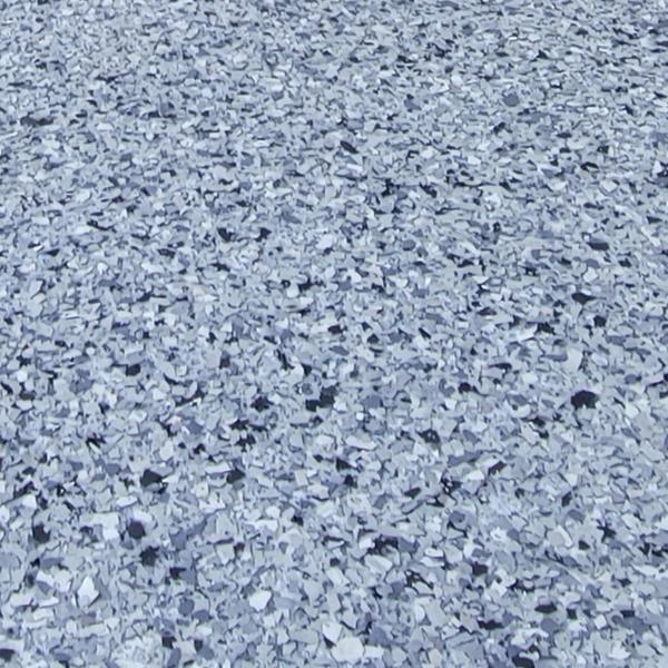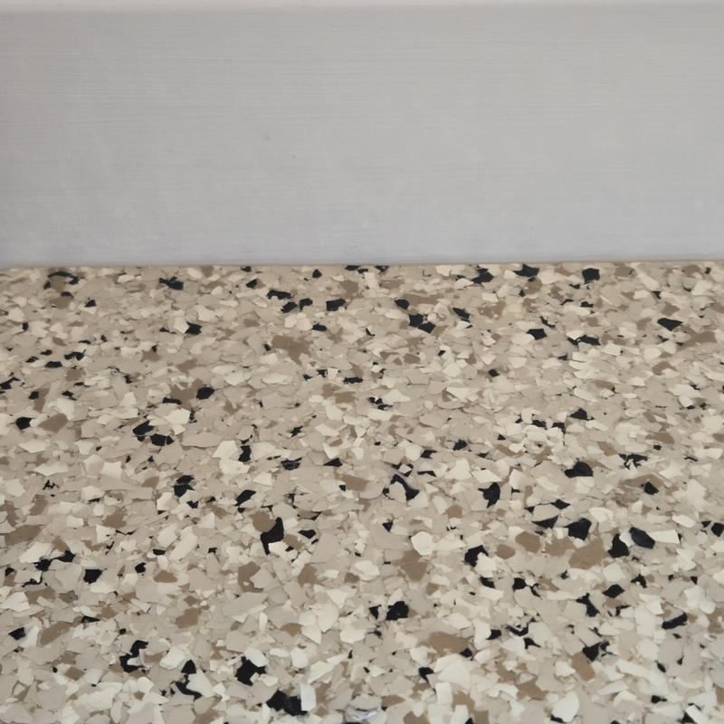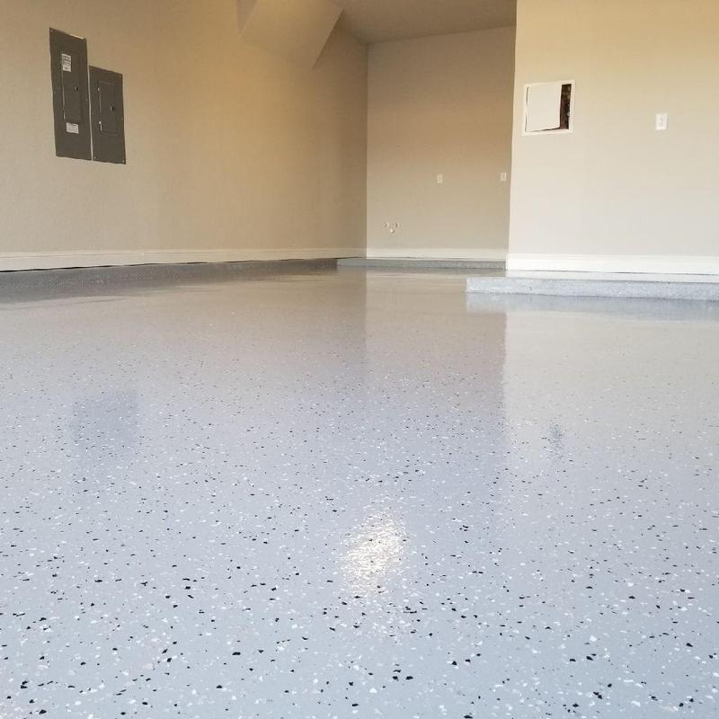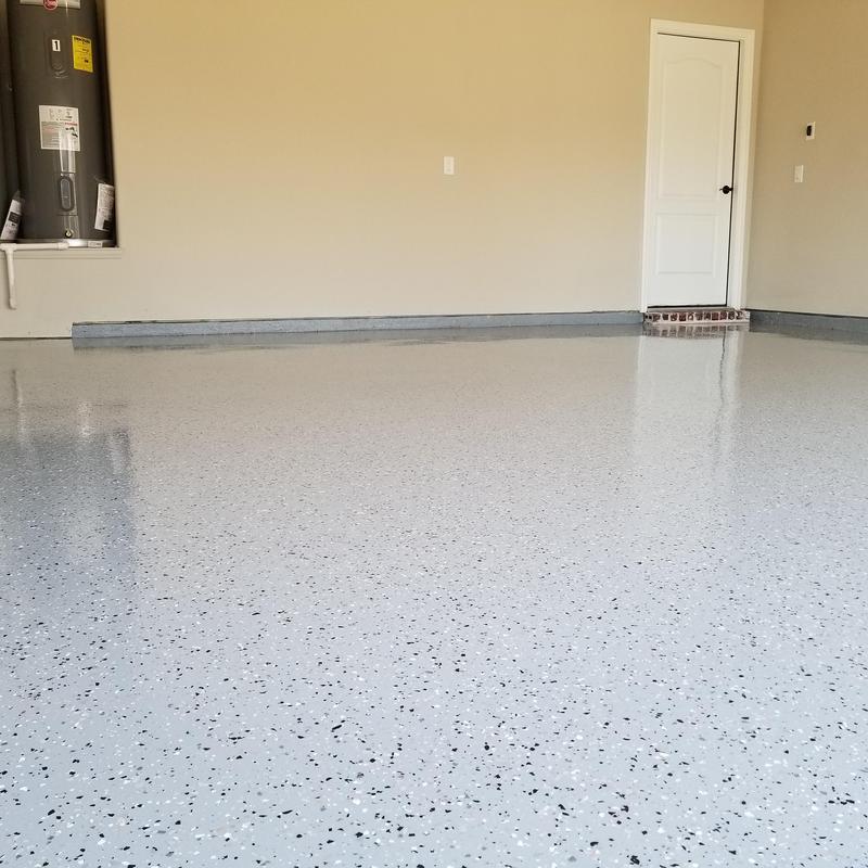 Epoxy Floored applied a slate gray base with 70% Domino flake coverage to a garage floor in McKinney, Texas. The team finished the surface with a water-based polyurethane top coat and added an anti-skid layer for improved safety and durability.