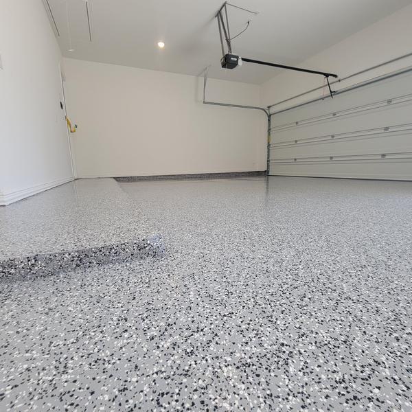 Epoxy Floored applied a custom tuxedo and snowfall flake blend with anti-skid additive in a polyaspartic top coat. This flooring upgrade was completed in Prosper, Texas, providing enhanced traction and durability for the surface.