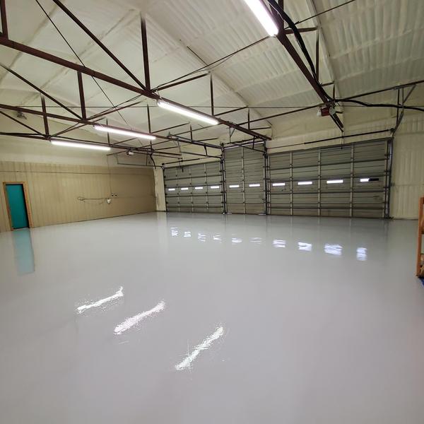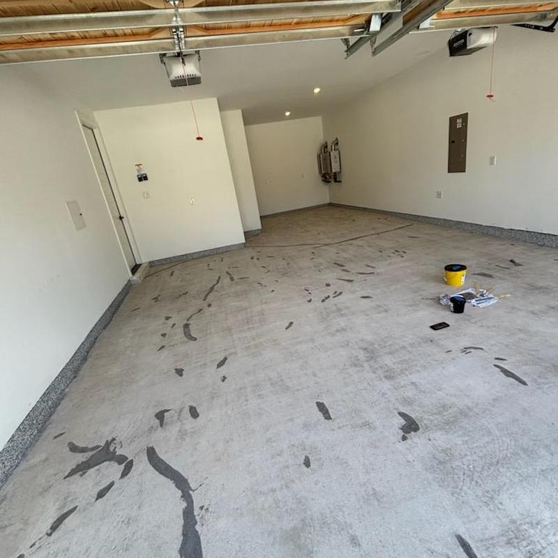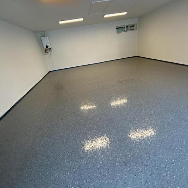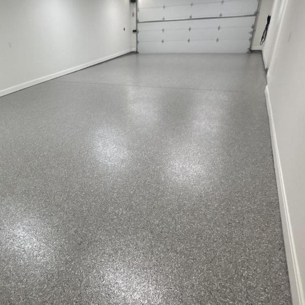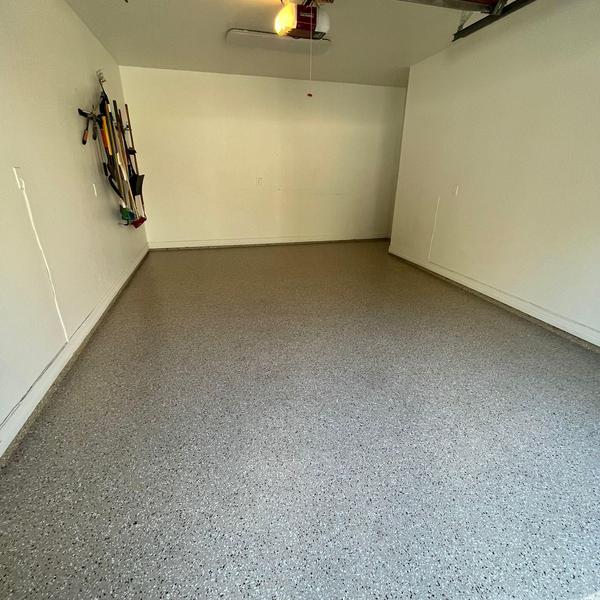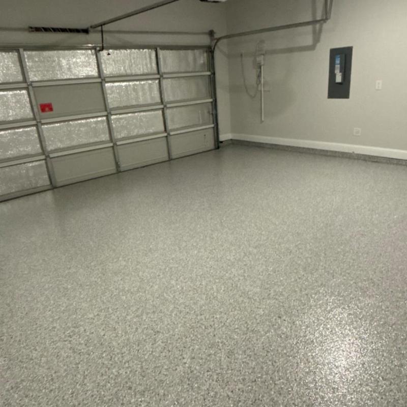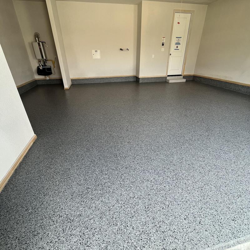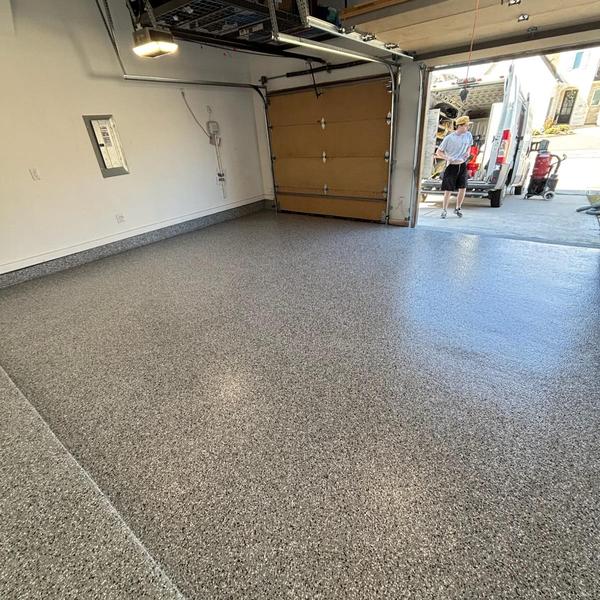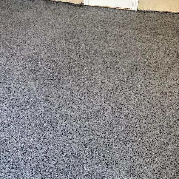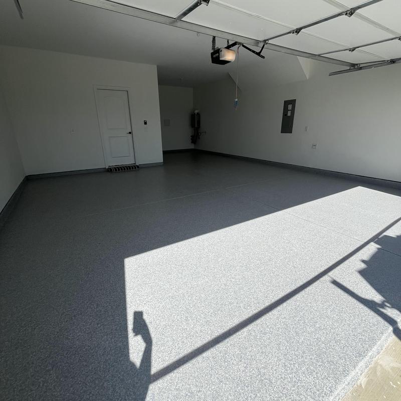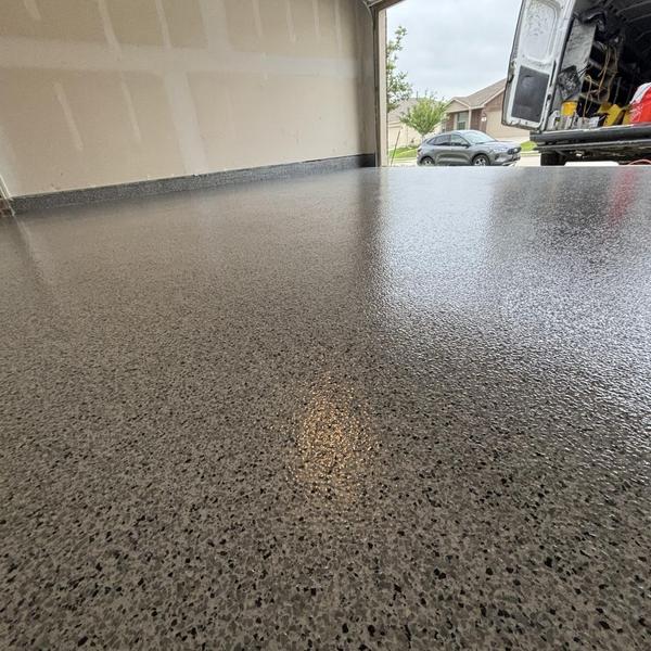 Installed a 400 sq ft slate gray polyaspartic floor with a snowfall blend and anti-skid finish in Prosper, Texas. This surface improves traction and protects concrete in garages and similar spaces. The coating resists wear and handles exposure to moisture and chemicals.