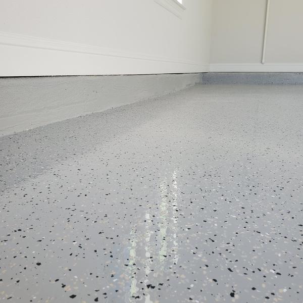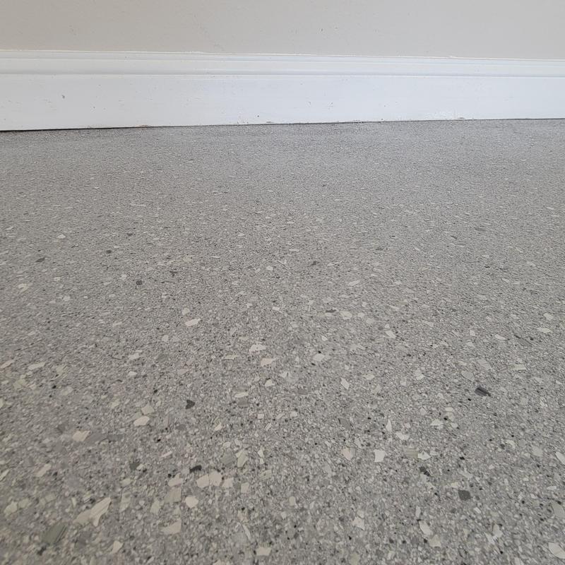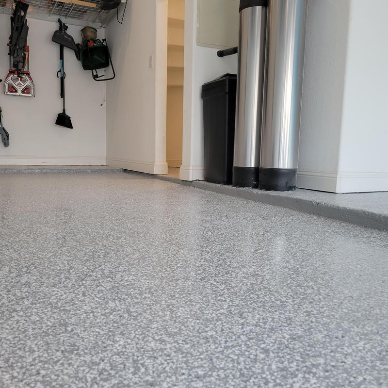 Epoxy Floored installed a light gray polyaspartic floor with snowfall random flakes and anti-skid texture in Carrollton, Texas. This economy coating system improves surface durability and safety with its slip-resistant finish, making it suitable for residential and light commercial spaces.