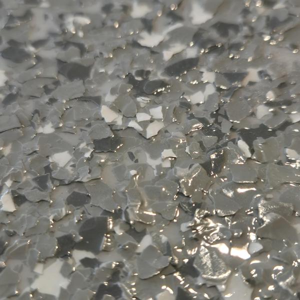 Epoxy Floored applied a random flake dolphin pattern in light gray with a polyurethane top coat in McKinney, Texas. This flooring upgrade improves durability and creates a uniform surface suitable for residential or commercial use.