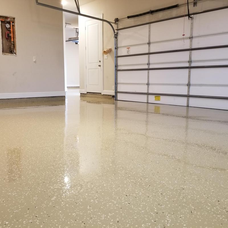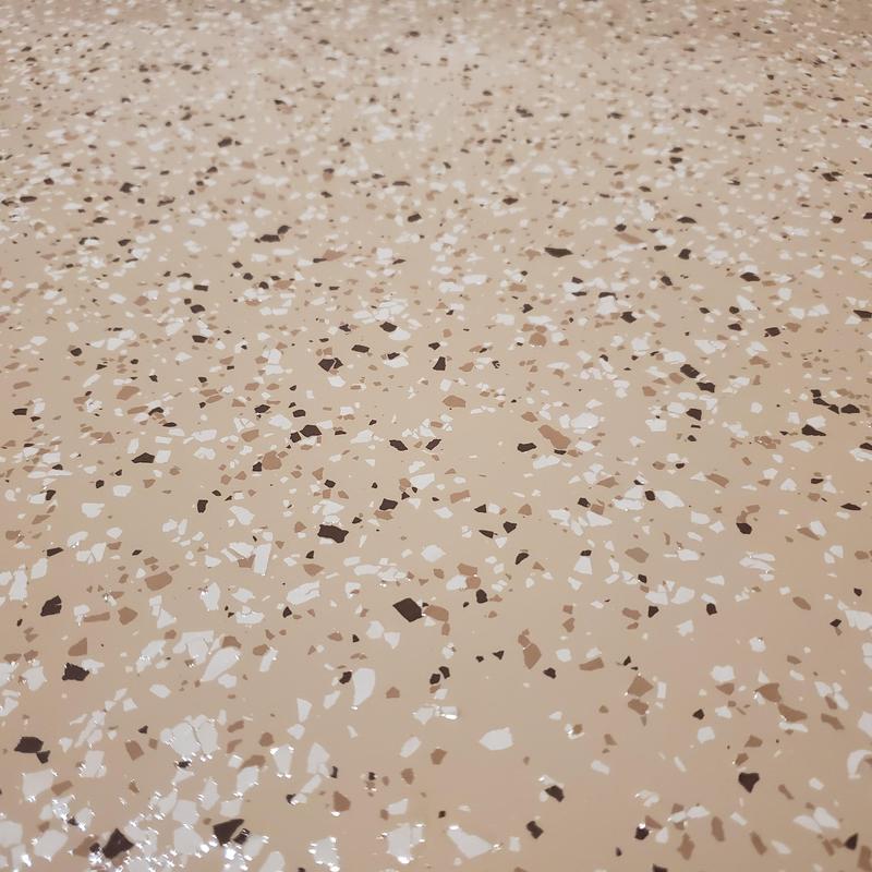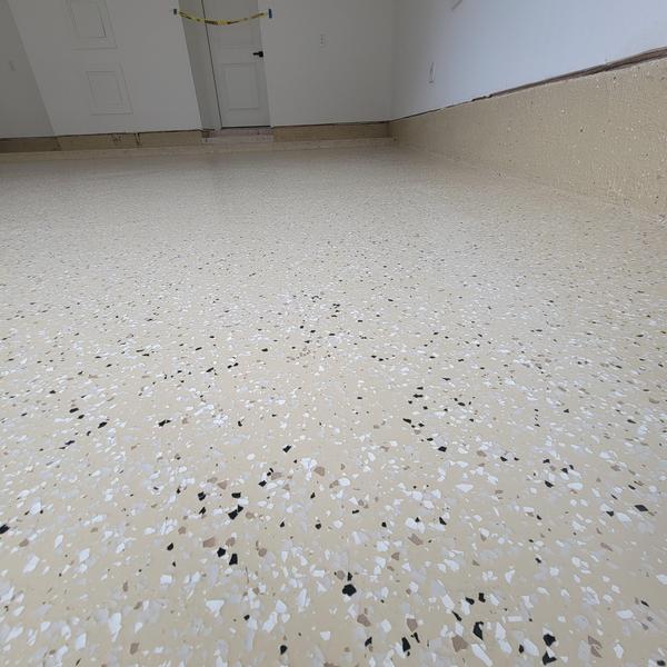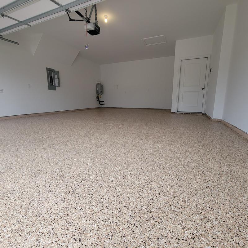 Epoxy Floored installed a light tan epoxy base with random flake and a polyurethane top coat in Celina, Texas. This flooring system adds a durable and easy-to-clean surface ideal for residential or commercial use. The flake pattern helps minimize visible wear and surface imperfections over time.