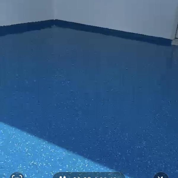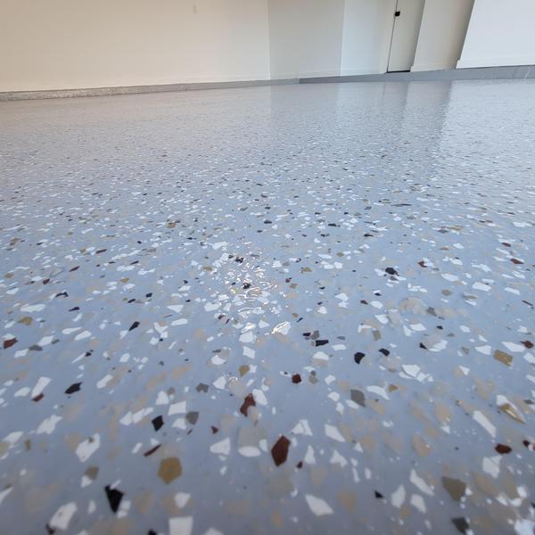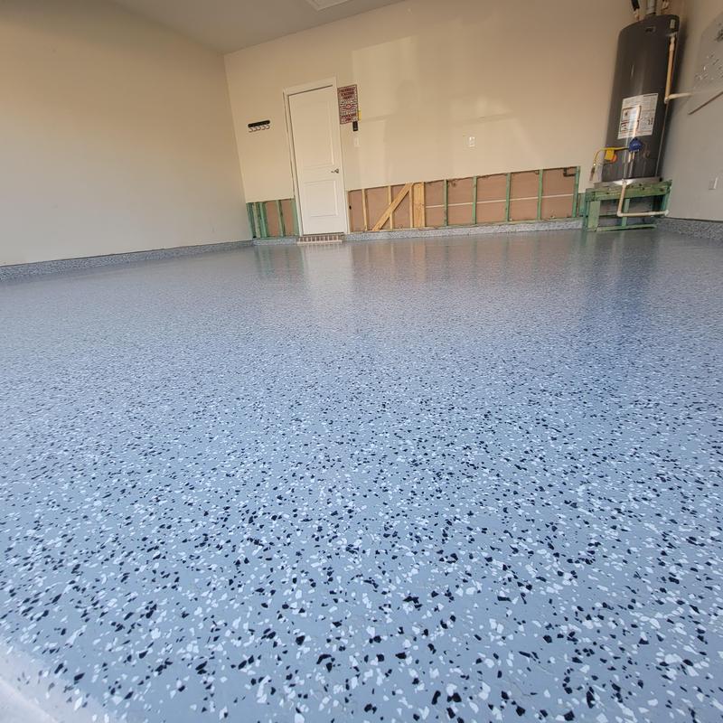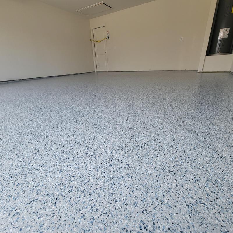 A contractor in Lewisville, Texas applied a whisper gray epoxy base coat with blue blend chips and finished it with a polyaspartic top coat that includes anti-skid protection. This epoxy flooring installation adds safety and durability to the surface.