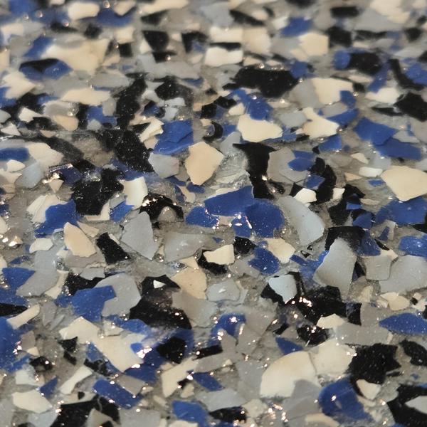 The team prepped and ground the concrete to create a profile, then applied a slate gray 100% solid epoxy floor with a 50-50 blend of Touch of Blue and Tuxedo decorative chips, finishing with a clear polyaspartic top coat and anti-skid surface in Princeton, Texas.