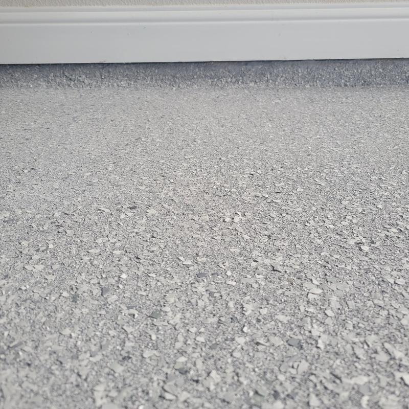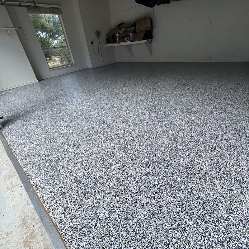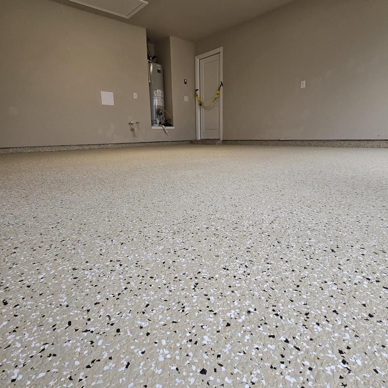 Epoxy Floored applied a polyaspartic floor coating with a custom 50% blend of Snowfall and Shoreline flakes in Denton, Texas. This finish provides a smooth surface that is easy to clean and resistant to UV damage, based on the homeowner’s request for lower texture coverage.