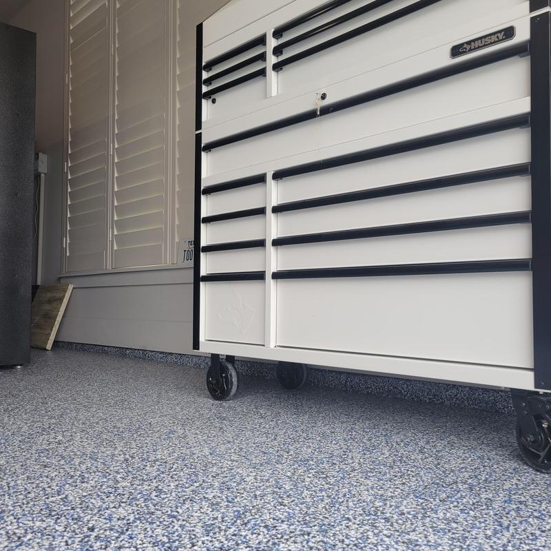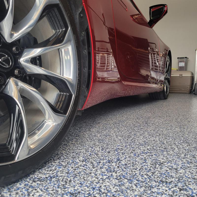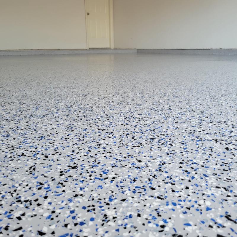 Epoxy Floored coated a three-car garage in Rockwall, Texas with a light gray base and blue decorative chips at 50–60% coverage. The team applied a UV-stable polyurethane top coat with anti-skid properties to improve durability and traction.