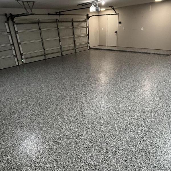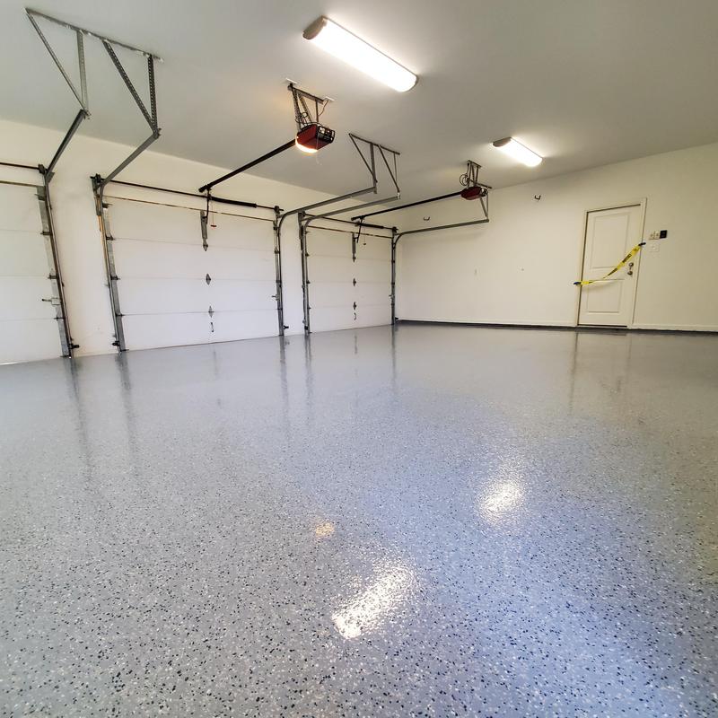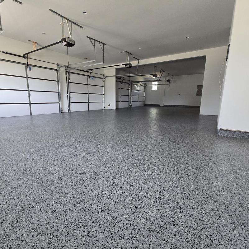 Epoxy Floored applied an epoxy base coat with a snowfall decorative chip and a clear polyaspartic top coat to a three-car garage in Celina, Texas. The finish includes anti-skid texture and UV-stable, chemical-resistant protection, improving surface durability and traction.