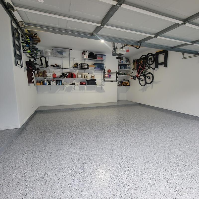 Contractors applied a snowfall blend epoxy coating to a garage floor in McKinney, Texas. The finish brightens the space and provides a smooth surface. A polyaspartic top coat was added to increase durability and ease of maintenance.