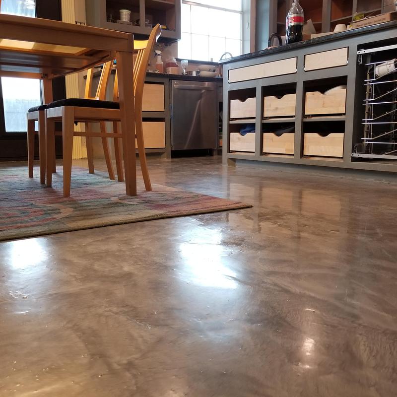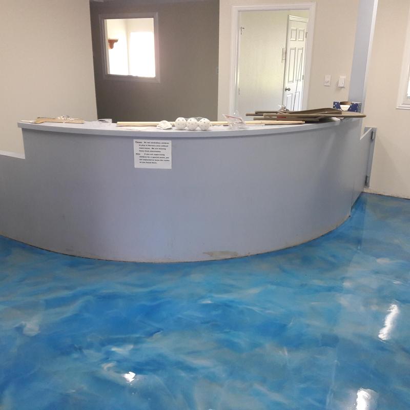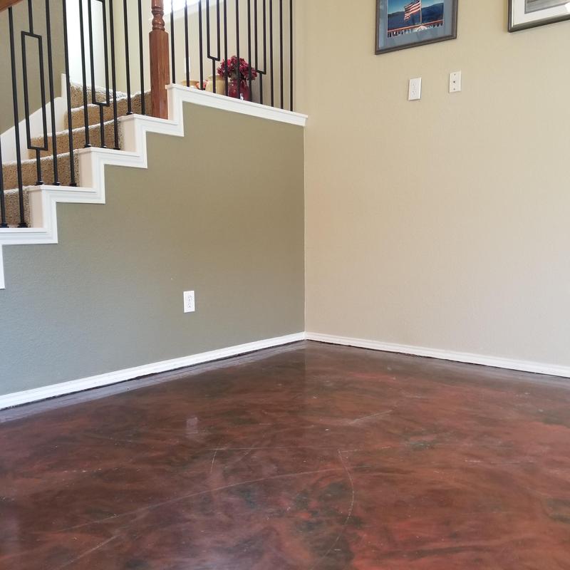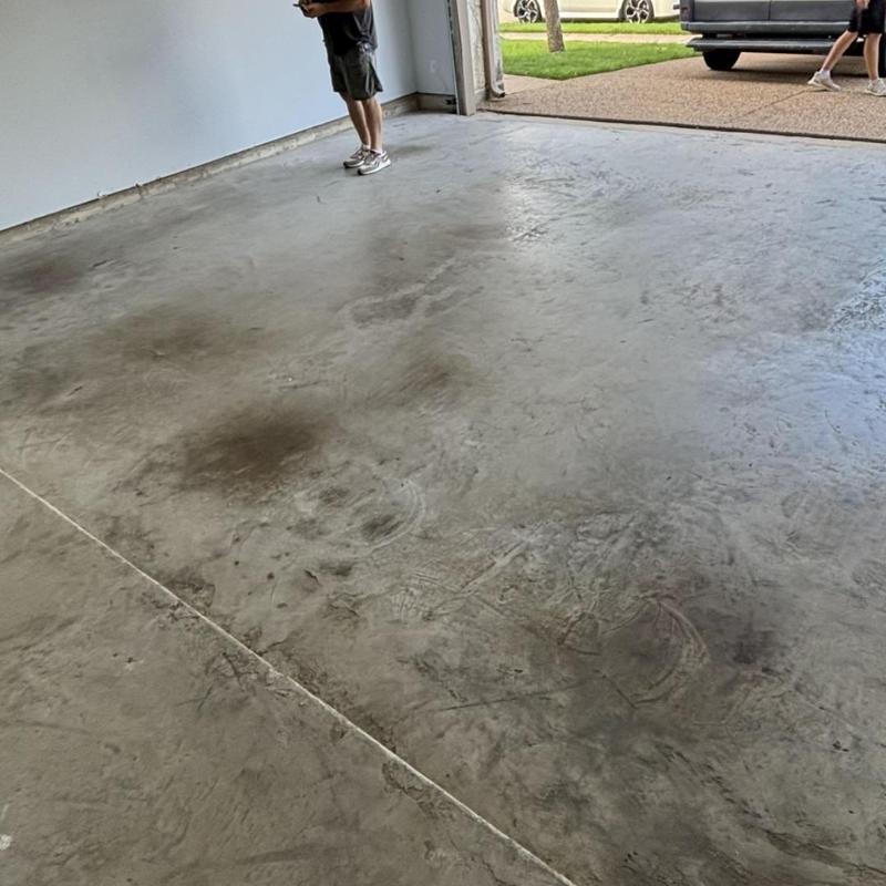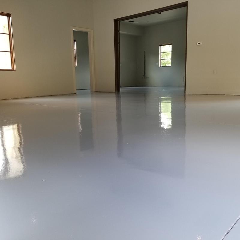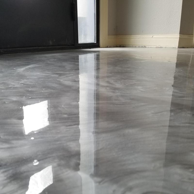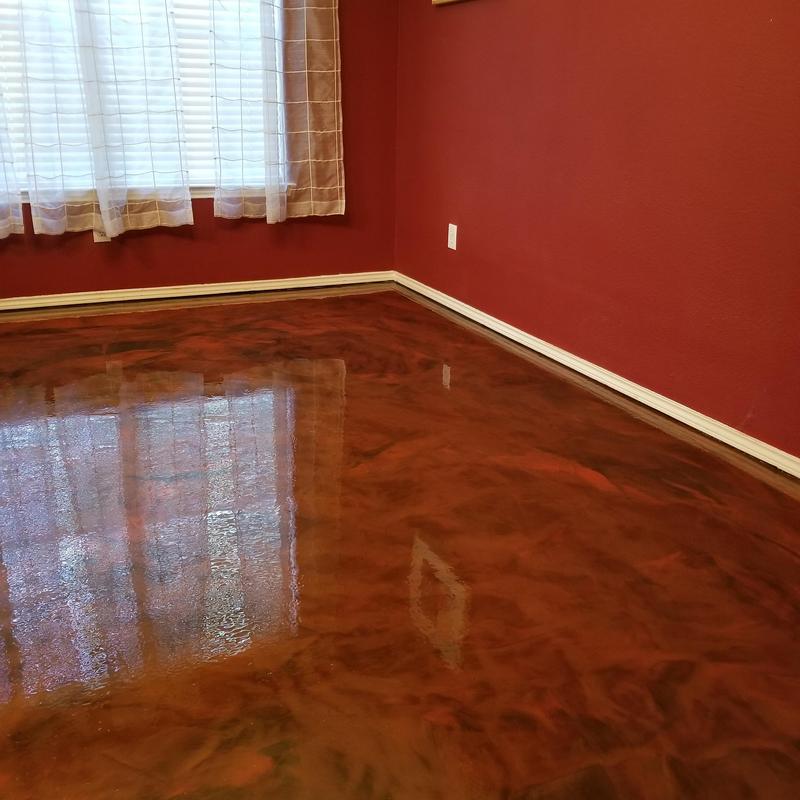 An epoxy flooring contractor applied a custom color blend in Allen, Texas. The project included a penetrating epoxy base sealed with a polyurethane top coat to improve surface durability and chemical resistance.