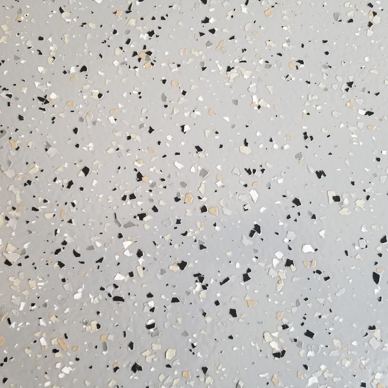 Contractors installed a light gray solar epoxy base with a custom Stony gray decorative chip blend in Van Alstyne, Texas. They completed the surface with a polyaspartic topcoat containing anti-skid additives to improve traction. The result is a clean, bright, and durable epoxy floor suitable for high-traffic use.