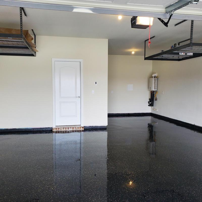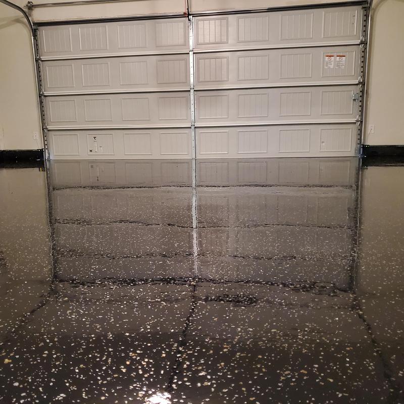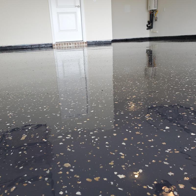 Installed an epoxy floor in McKinney, Texas using a black base with decorative chips and glitter. Applied a polyurethane top coat to complete the finish. This flooring improves surface durability and adds visual texture suitable for residential or commercial use.