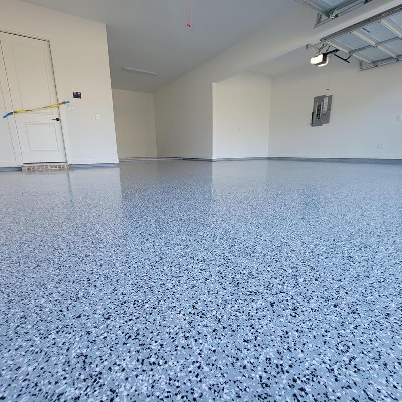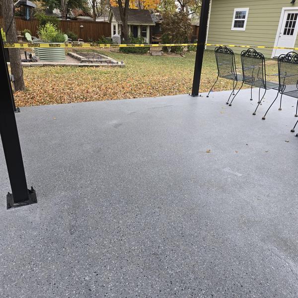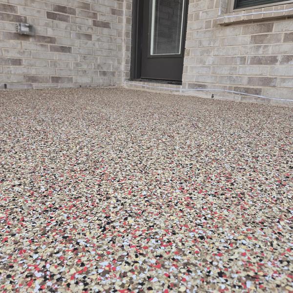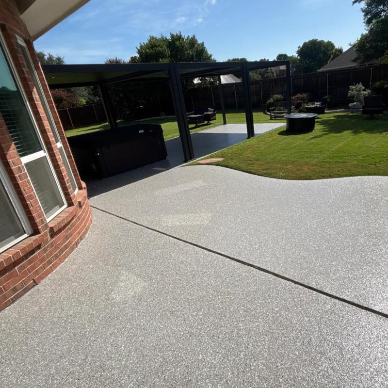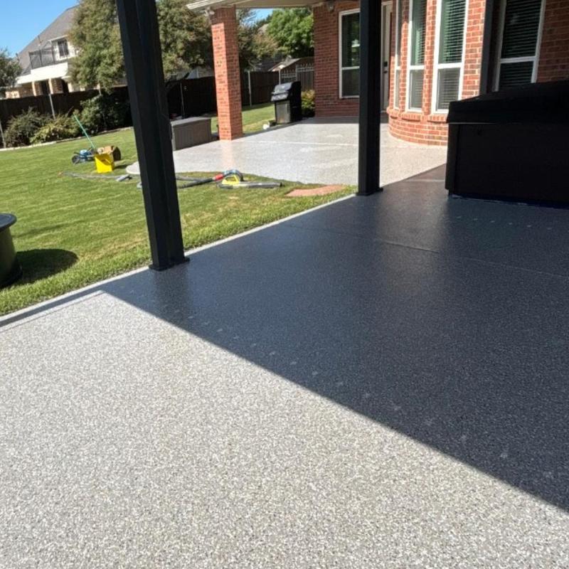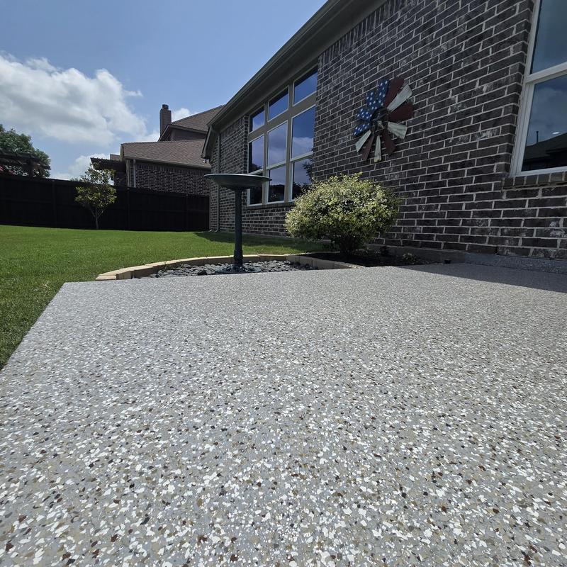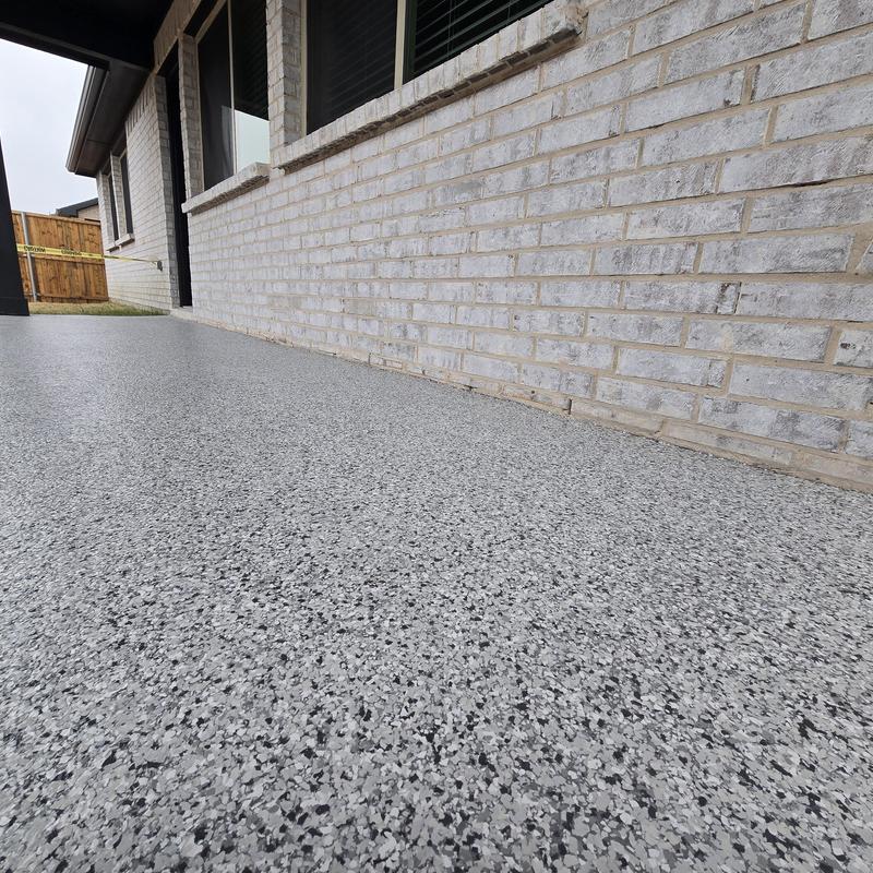 Epoxy Floored installed a polyaspartic chipped floor in a snowfall blend on a residential patio in Celina, Texas. The coating adds durability and is resistant to wear from sunlight and moisture, making it suitable for outdoor surfaces. The chip finish provides a uniform texture and enhances slip resistance.