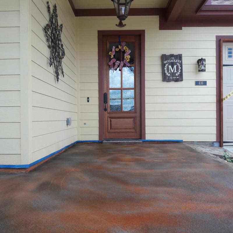 Epoxy Floored applied an acid-stained overlay on a concrete surface in Allen, Texas. This process added a durable and decorative finish, enhancing the surface with a mottled, natural stone appearance suitable for indoor or outdoor use.